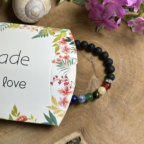 Chakraperlenarmband aus Lava-, Halbedelstein- und Edelstahlperlen auf Gummiband.
