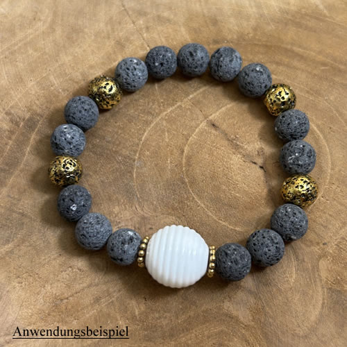 Der Aligner wird mit dem kleinen Zapfen („Pömpel“) in das Loch der Perle eingesetzt und dient auf der anderen Seite als flacher Abschluss. Ideal zur Verwendung mit Quetschperlen, um Perlen auf Ketten sicher zu fixieren